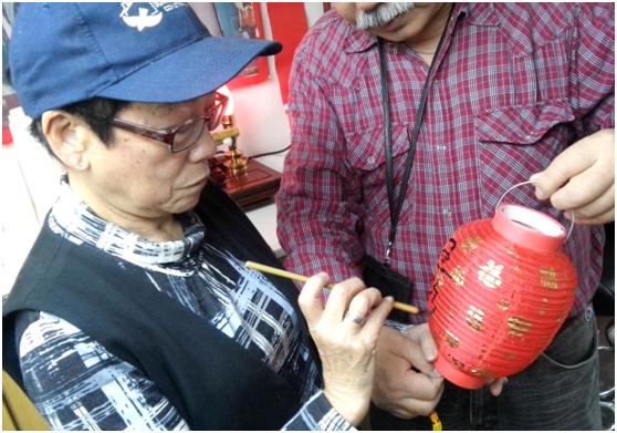 祖母示範正統抓毛筆方法寫大名在燈籠上點燈,願望:不要忘了毛筆書法 |